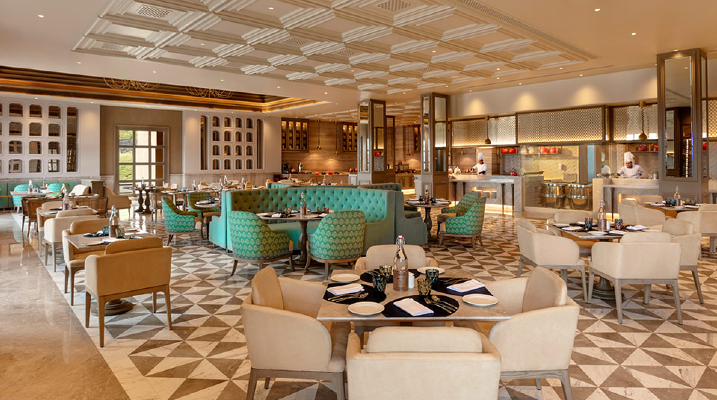 Calm, contemporary interiors with understated elegance, soft lighting, and refined accents create a tranquil setting for intimate dining.